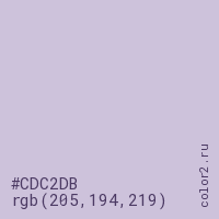 Цвет #CDC2DB в цветовой модели RGB обозначается тремя октетами (205, 194, 219) в десятичном формате и #CDC2DB в шестнадцатиричном (hex) формате, которые являются интенсивностью красного 205 (hex CD), интенсивность зелёного 194 (hex C2) и интенсивность синего 219 (hex DB).