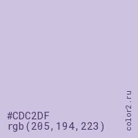 Цвет #CDC2DF в цветовой модели RGB обозначается тремя октетами (205, 194, 223) в десятичном формате и #CDC2DF в шестнадцатиричном (hex) формате, которые являются интенсивностью красного 205 (hex CD), интенсивность зелёного 194 (hex C2) и интенсивность синего 223 (hex DF).