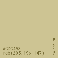 Цвет #CDC493 в цветовой модели RGB обозначается тремя октетами (205, 196, 147) в десятичном формате и #CDC493 в шестнадцатиричном (hex) формате, которые являются интенсивностью красного 205 (hex CD), интенсивность зелёного 196 (hex C4) и интенсивность синего 147 (hex 93).