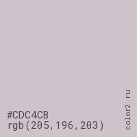 Цвет #CDC4CB в цветовой модели RGB обозначается тремя октетами (205, 196, 203) в десятичном формате и #CDC4CB в шестнадцатиричном (hex) формате, которые являются интенсивностью красного 205 (hex CD), интенсивность зелёного 196 (hex C4) и интенсивность синего 203 (hex CB).