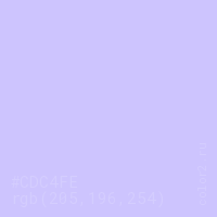 Цвет RGB(205, 196, 254) в процентом отношении количества цвета состоит из 80.4% красного (red), 76.9% зелёного (green) и 99.6% синего (blue).