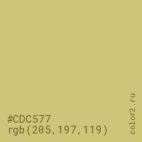 Цвет #CDC577 в цветовой модели RGB обозначается тремя октетами (205, 197, 119) в десятичном формате и #CDC577 в шестнадцатиричном (hex) формате, которые являются интенсивностью красного 205 (hex CD), интенсивность зелёного 197 (hex C5) и интенсивность синего 119 (hex 77).