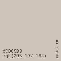 Цвет #CDC5B8 в цветовой модели RGB обозначается тремя октетами (205, 197, 184) в десятичном формате и #CDC5B8 в шестнадцатиричном (hex) формате, которые являются интенсивностью красного 205 (hex CD), интенсивность зелёного 197 (hex C5) и интенсивность синего 184 (hex B8).