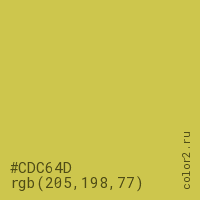 Цвет #CDC64D в цветовой модели RGB обозначается тремя октетами (205, 198, 77) в десятичном формате и #CDC64D в шестнадцатиричном (hex) формате, которые являются интенсивностью красного 205 (hex CD), интенсивность зелёного 198 (hex C6) и интенсивность синего 77 (hex 4D).