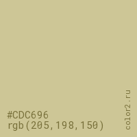 Цвет #CDC696 в цветовой модели RGB обозначается тремя октетами (205, 198, 150) в десятичном формате и #CDC696 в шестнадцатиричном (hex) формате, которые являются интенсивностью красного 205 (hex CD), интенсивность зелёного 198 (hex C6) и интенсивность синего 150 (hex 96).