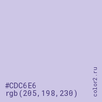 Цвет #CDC6E6 в цветовой модели RGB обозначается тремя октетами (205, 198, 230) в десятичном формате и #CDC6E6 в шестнадцатиричном (hex) формате, которые являются интенсивностью красного 205 (hex CD), интенсивность зелёного 198 (hex C6) и интенсивность синего 230 (hex E6).