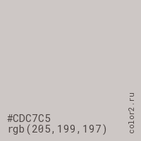 Цвет #CDC7C5 в цветовой модели RGB обозначается тремя октетами (205, 199, 197) в десятичном формате и #CDC7C5 в шестнадцатиричном (hex) формате, которые являются интенсивностью красного 205 (hex CD), интенсивность зелёного 199 (hex C7) и интенсивность синего 197 (hex C5).