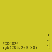 Цвет #CDC826 в цветовой модели RGB обозначается тремя октетами (205, 200, 38) в десятичном формате и #CDC826 в шестнадцатиричном (hex) формате, которые являются интенсивностью красного 205 (hex CD), интенсивность зелёного 200 (hex C8) и интенсивность синего 38 (hex 26).