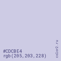 Цвет #CDCBE4 в цветовой модели RGB обозначается тремя октетами (205, 203, 228) в десятичном формате и #CDCBE4 в шестнадцатиричном (hex) формате, которые являются интенсивностью красного 205 (hex CD), интенсивность зелёного 203 (hex CB) и интенсивность синего 228 (hex E4).