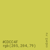 Цвет #CDCC4F в цветовой модели RGB обозначается тремя октетами (205, 204, 79) в десятичном формате и #CDCC4F в шестнадцатиричном (hex) формате, которые являются интенсивностью красного 205 (hex CD), интенсивность зелёного 204 (hex CC) и интенсивность синего 79 (hex 4F).
