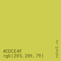 Цвет #CDCE4F в цветовой модели RGB обозначается тремя октетами (205, 206, 79) в десятичном формате и #CDCE4F в шестнадцатиричном (hex) формате, которые являются интенсивностью красного 205 (hex CD), интенсивность зелёного 206 (hex CE) и интенсивность синего 79 (hex 4F).