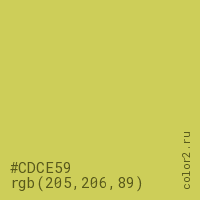 Цвет #CDCE59 в цветовой модели RGB обозначается тремя октетами (205, 206, 89) в десятичном формате и #CDCE59 в шестнадцатиричном (hex) формате, которые являются интенсивностью красного 205 (hex CD), интенсивность зелёного 206 (hex CE) и интенсивность синего 89 (hex 59).