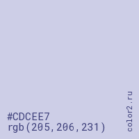 Цвет #CDCEE7 в цветовой модели RGB обозначается тремя октетами (205, 206, 231) в десятичном формате и #CDCEE7 в шестнадцатиричном (hex) формате, которые являются интенсивностью красного 205 (hex CD), интенсивность зелёного 206 (hex CE) и интенсивность синего 231 (hex E7).