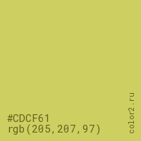 Цвет #CDCF61 в цветовой модели RGB обозначается тремя октетами (205, 207, 97) в десятичном формате и #CDCF61 в шестнадцатиричном (hex) формате, которые являются интенсивностью красного 205 (hex CD), интенсивность зелёного 207 (hex CF) и интенсивность синего 97 (hex 61).