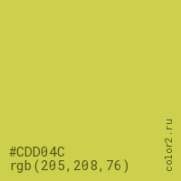 Цвет #CDD04C в цветовой модели RGB обозначается тремя октетами (205, 208, 76) в десятичном формате и #CDD04C в шестнадцатиричном (hex) формате, которые являются интенсивностью красного 205 (hex CD), интенсивность зелёного 208 (hex D0) и интенсивность синего 76 (hex 4C).