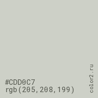Цвет #CDD0C7 в цветовой модели RGB обозначается тремя октетами (205, 208, 199) в десятичном формате и #CDD0C7 в шестнадцатиричном (hex) формате, которые являются интенсивностью красного 205 (hex CD), интенсивность зелёного 208 (hex D0) и интенсивность синего 199 (hex C7).