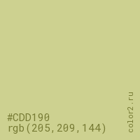 Цвет #CDD190 в цветовой модели RGB обозначается тремя октетами (205, 209, 144) в десятичном формате и #CDD190 в шестнадцатиричном (hex) формате, которые являются интенсивностью красного 205 (hex CD), интенсивность зелёного 209 (hex D1) и интенсивность синего 144 (hex 90).
