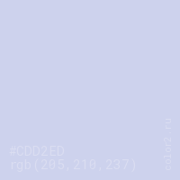 Цвет #CDD2ED в цветовой модели RGB обозначается тремя октетами (205, 210, 237) в десятичном формате и #CDD2ED в шестнадцатиричном (hex) формате, которые являются интенсивностью красного 205 (hex CD), интенсивность зелёного 210 (hex D2) и интенсивность синего 237 (hex ED).