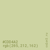 Цвет #CDD4A2 в цветовой модели RGB обозначается тремя октетами (205, 212, 162) в десятичном формате и #CDD4A2 в шестнадцатиричном (hex) формате, которые являются интенсивностью красного 205 (hex CD), интенсивность зелёного 212 (hex D4) и интенсивность синего 162 (hex A2).