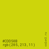 Цвет #CDD50B в цветовой модели RGB обозначается тремя октетами (205, 213, 11) в десятичном формате и #CDD50B в шестнадцатиричном (hex) формате, которые являются интенсивностью красного 205 (hex CD), интенсивность зелёного 213 (hex D5) и интенсивность синего 11 (hex 0B).