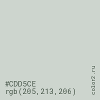 Цвет #CDD5CE в цветовой модели RGB обозначается тремя октетами (205, 213, 206) в десятичном формате и #CDD5CE в шестнадцатиричном (hex) формате, которые являются интенсивностью красного 205 (hex CD), интенсивность зелёного 213 (hex D5) и интенсивность синего 206 (hex CE).