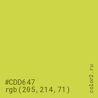 Цвет #CDD647 в цветовой модели RGB обозначается тремя октетами (205, 214, 71) в десятичном формате и #CDD647 в шестнадцатиричном (hex) формате, которые являются интенсивностью красного 205 (hex CD), интенсивность зелёного 214 (hex D6) и интенсивность синего 71 (hex 47).