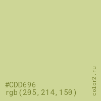 Цвет #CDD696 в цветовой модели RGB обозначается тремя октетами (205, 214, 150) в десятичном формате и #CDD696 в шестнадцатиричном (hex) формате, которые являются интенсивностью красного 205 (hex CD), интенсивность зелёного 214 (hex D6) и интенсивность синего 150 (hex 96).