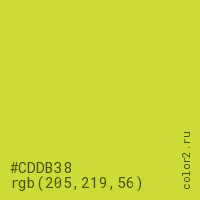 Цвет #CDDB38 в цветовой модели RGB обозначается тремя октетами (205, 219, 56) в десятичном формате и #CDDB38 в шестнадцатиричном (hex) формате, которые являются интенсивностью красного 205 (hex CD), интенсивность зелёного 219 (hex DB) и интенсивность синего 56 (hex 38).