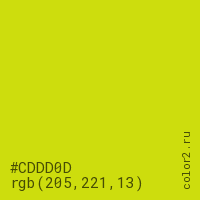 Цвет #CDDD0D в цветовой модели RGB обозначается тремя октетами (205, 221, 13) в десятичном формате и #CDDD0D в шестнадцатиричном (hex) формате, которые являются интенсивностью красного 205 (hex CD), интенсивность зелёного 221 (hex DD) и интенсивность синего 13 (hex 0D).