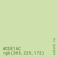 Цвет #CDE1AC в цветовой модели RGB обозначается тремя октетами (205, 225, 172) в десятичном формате и #CDE1AC в шестнадцатиричном (hex) формате, которые являются интенсивностью красного 205 (hex CD), интенсивность зелёного 225 (hex E1) и интенсивность синего 172 (hex AC).