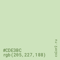 Цвет #CDE3BC в цветовой модели RGB обозначается тремя октетами (205, 227, 188) в десятичном формате и #CDE3BC в шестнадцатиричном (hex) формате, которые являются интенсивностью красного 205 (hex CD), интенсивность зелёного 227 (hex E3) и интенсивность синего 188 (hex BC).