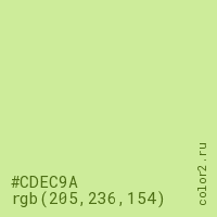 Цвет RGB(205, 236, 154) в процентом отношении количества цвета состоит из 80.4% красного (red), 92.5% зелёного (green) и 60.4% синего (blue).