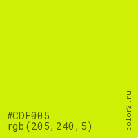 Цвет #CDF005 в цветовой модели RGB обозначается тремя октетами (205, 240, 5) в десятичном формате и #CDF005 в шестнадцатиричном (hex) формате, которые являются интенсивностью красного 205 (hex CD), интенсивность зелёного 240 (hex F0) и интенсивность синего 5 (hex 05).
