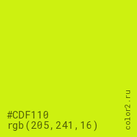 Цвет #CDF110 в цветовой модели RGB обозначается тремя октетами (205, 241, 16) в десятичном формате и #CDF110 в шестнадцатиричном (hex) формате, которые являются интенсивностью красного 205 (hex CD), интенсивность зелёного 241 (hex F1) и интенсивность синего 16 (hex 10).