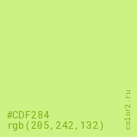 Цвет #CDF284 в цветовой модели RGB обозначается тремя октетами (205, 242, 132) в десятичном формате и #CDF284 в шестнадцатиричном (hex) формате, которые являются интенсивностью красного 205 (hex CD), интенсивность зелёного 242 (hex F2) и интенсивность синего 132 (hex 84).