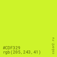Цвет #CDF329 в цветовой модели RGB обозначается тремя октетами (205, 243, 41) в десятичном формате и #CDF329 в шестнадцатиричном (hex) формате, которые являются интенсивностью красного 205 (hex CD), интенсивность зелёного 243 (hex F3) и интенсивность синего 41 (hex 29).