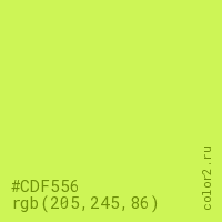 Цвет #CDF556 в цветовой модели RGB обозначается тремя октетами (205, 245, 86) в десятичном формате и #CDF556 в шестнадцатиричном (hex) формате, которые являются интенсивностью красного 205 (hex CD), интенсивность зелёного 245 (hex F5) и интенсивность синего 86 (hex 56).