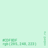 Цвет #CDF8DF в цветовой модели RGB обозначается тремя октетами (205, 248, 223) в десятичном формате и #CDF8DF в шестнадцатиричном (hex) формате, которые являются интенсивностью красного 205 (hex CD), интенсивность зелёного 248 (hex F8) и интенсивность синего 223 (hex DF).