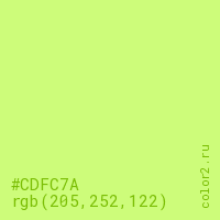 Цвет RGB(205, 252, 122) в процентом отношении количества цвета состоит из 80.4% красного (red), 98.8% зелёного (green) и 47.8% синего (blue).