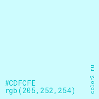 Цвет #CDFCFE в цветовой модели RGB обозначается тремя октетами (205, 252, 254) в десятичном формате и #CDFCFE в шестнадцатиричном (hex) формате, которые являются интенсивностью красного 205 (hex CD), интенсивность зелёного 252 (hex FC) и интенсивность синего 254 (hex FE).