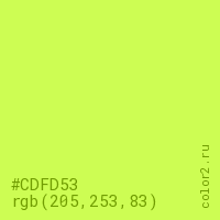 Цвет #CDFD53 в цветовой модели RGB обозначается тремя октетами (205, 253, 83) в десятичном формате и #CDFD53 в шестнадцатиричном (hex) формате, которые являются интенсивностью красного 205 (hex CD), интенсивность зелёного 253 (hex FD) и интенсивность синего 83 (hex 53).