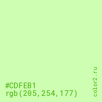 Цвет #CDFEB1 в цветовой модели RGB обозначается тремя октетами (205, 254, 177) в десятичном формате и #CDFEB1 в шестнадцатиричном (hex) формате, которые являются интенсивностью красного 205 (hex CD), интенсивность зелёного 254 (hex FE) и интенсивность синего 177 (hex B1).