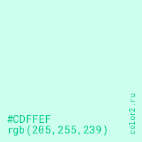 Цвет #CDFFEF в цветовой модели RGB обозначается тремя октетами (205, 255, 239) в десятичном формате и #CDFFEF в шестнадцатиричном (hex) формате, которые являются интенсивностью красного 205 (hex CD), интенсивность зелёного 255 (hex FF) и интенсивность синего 239 (hex EF).