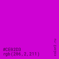 Цвет #CE02D3 в цветовой модели RGB обозначается тремя октетами (206, 2, 211) в десятичном формате и #CE02D3 в шестнадцатиричном (hex) формате, которые являются интенсивностью красного 206 (hex CE), интенсивность зелёного 2 (hex 02) и интенсивность синего 211 (hex D3).