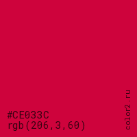 Цвет #CE033C в цветовой модели RGB обозначается тремя октетами (206, 3, 60) в десятичном формате и #CE033C в шестнадцатиричном (hex) формате, которые являются интенсивностью красного 206 (hex CE), интенсивность зелёного 3 (hex 03) и интенсивность синего 60 (hex 3C).