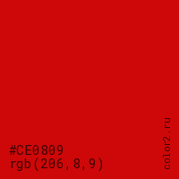 Цвет #CE0809 в цветовой модели RGB обозначается тремя октетами (206, 8, 9) в десятичном формате и #CE0809 в шестнадцатиричном (hex) формате, которые являются интенсивностью красного 206 (hex CE), интенсивность зелёного 8 (hex 08) и интенсивность синего 9 (hex 09).