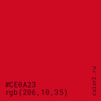 Цвет #CE0A23 в цветовой модели RGB обозначается тремя октетами (206, 10, 35) в десятичном формате и #CE0A23 в шестнадцатиричном (hex) формате, которые являются интенсивностью красного 206 (hex CE), интенсивность зелёного 10 (hex 0A) и интенсивность синего 35 (hex 23).