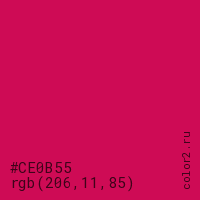 Цвет #CE0B55 в цветовой модели RGB обозначается тремя октетами (206, 11, 85) в десятичном формате и #CE0B55 в шестнадцатиричном (hex) формате, которые являются интенсивностью красного 206 (hex CE), интенсивность зелёного 11 (hex 0B) и интенсивность синего 85 (hex 55).