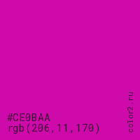 Цвет #CE0BAA в цветовой модели RGB обозначается тремя октетами (206, 11, 170) в десятичном формате и #CE0BAA в шестнадцатиричном (hex) формате, которые являются интенсивностью красного 206 (hex CE), интенсивность зелёного 11 (hex 0B) и интенсивность синего 170 (hex AA).