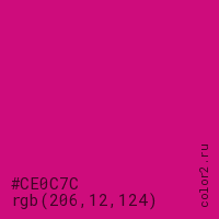 Цвет #CE0C7C в цветовой модели RGB обозначается тремя октетами (206, 12, 124) в десятичном формате и #CE0C7C в шестнадцатиричном (hex) формате, которые являются интенсивностью красного 206 (hex CE), интенсивность зелёного 12 (hex 0C) и интенсивность синего 124 (hex 7C).